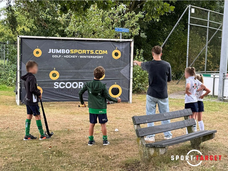 Voor een sportieve activatiecampagne heeft JumboSports gekozen voor een op maat gemaakt hockeytarget van Sporttarget. Dit opvallende hockey gatendoek daagt deelnemers uit om te scoren door de juiste gaten te raken — met als extra motivatie: kans maken op mooie prijzen!
